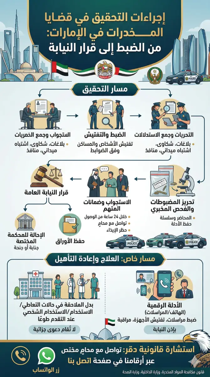 إجراءات التحقيق في قضايا المخدرات في الإمارات تمر بسلسلة مراحل دقيقة تبدأ من التحريات وجمع الاستدلالات، ثم الضبط والتفتيش وتحريز المضبوطات وإحالتها للفحص المخبري، وصولًا إلى الاستجواب وقرارات النيابة العامة بالحفظ أو الإحالة للمحكمة.