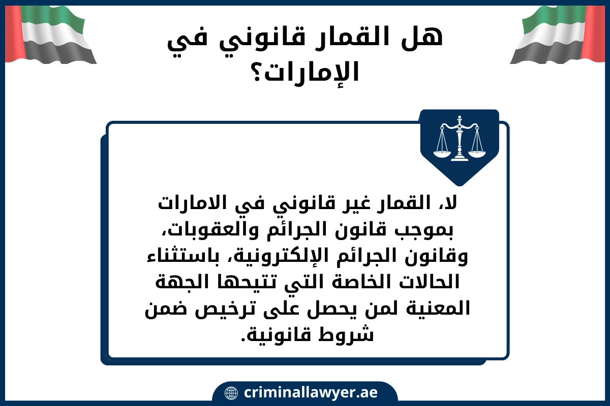 تعتبر الإمارات إحدى الدول الملتزمة بتطبيق قواعد وأحكام عقابية فيما يتعلق بممارسة القمار، بوصفه نشاط محظور يتعارض مع مبادئ وقيم ثقافية ودينية.